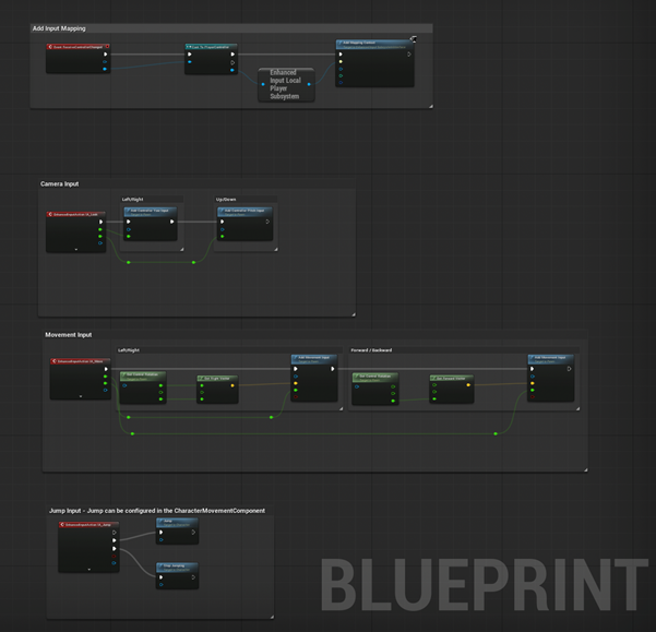 In the player character blueprint we can see all the different instructions attached to our character. Be careful not to remove anything here – you character might become unable to move, jump or adjust the camera.