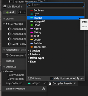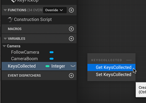 On the left side, add a variable and name it “[items]collected”. I called mine KeysCollected. Change this variable from a Boolean to an Integer. This means the variable will track whole numbers.
