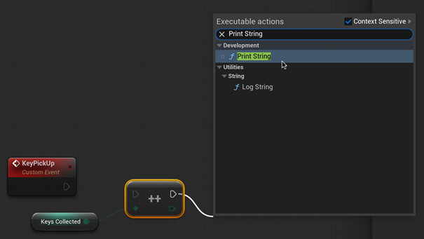 From the node we just created, drag the top arrow into a blank space in the event editor. Type and select “Print String”.