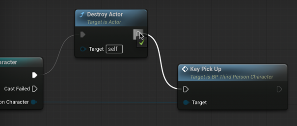 Finally, let’s make the collectable disappear when we collect it. From the top right arrow of Cast To BP_ThirdPersonCharacter drag and release to a blank space in the Event Graph. Type “Destroy Actor” and select this from the menu.