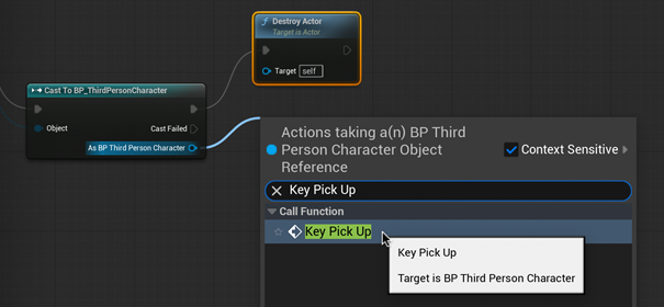 In our collectable object blueprint, drag out from “As BP Third Person Character” and release. Type and select “[Item] Pick Up”, this is the function you named earlier.